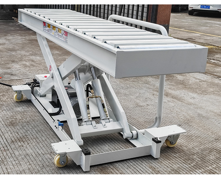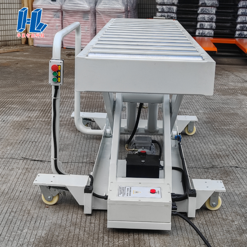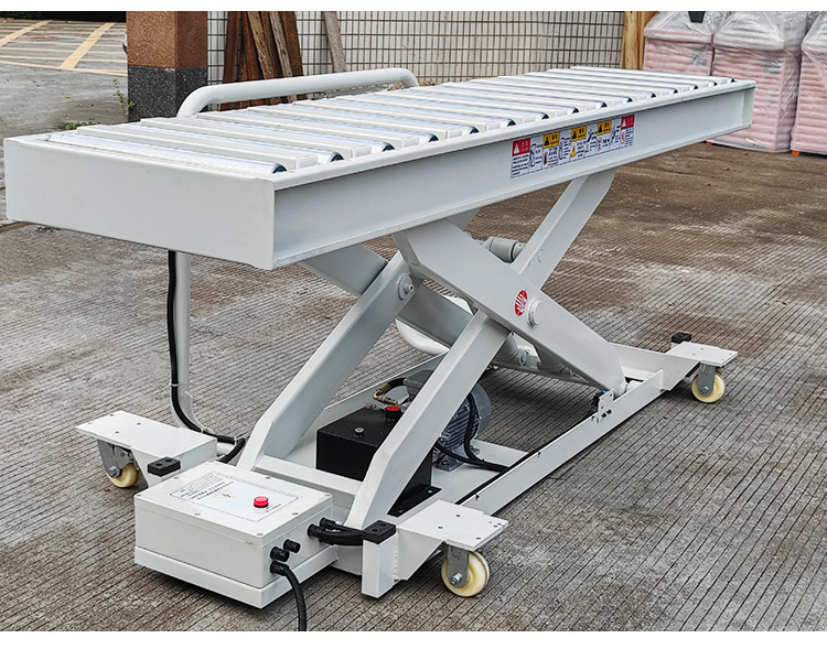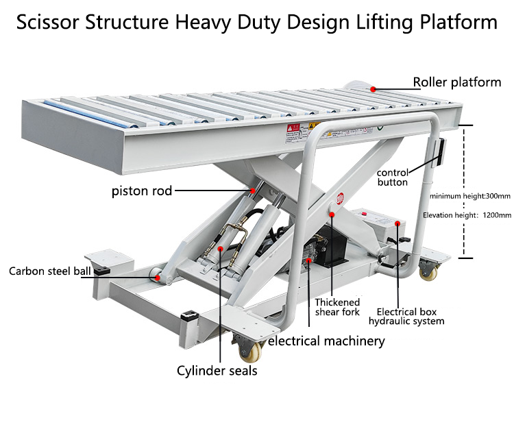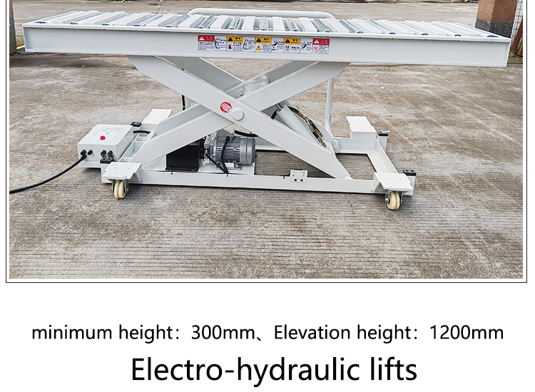 1-ton drum elevator (hand-pushed button model) Technical Parameters: 1. Dimensions: 2500X600mm (length x width) 2. Lowering height: 300mm, lifting height: 1200mm 3. Load capacity: 1 ton 4. Motor power: 2.2KW single-acting (380V; 50HZ) built-in (can be modified according to the voltage of each country) 5. Light gray color, manual foot pedal control.
