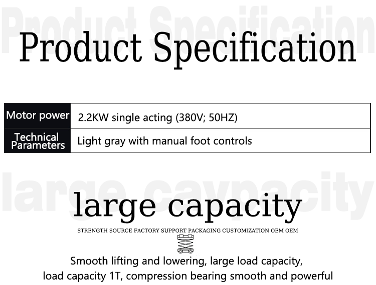 The 1T Scissor Lift Hydraulic Jack Platform is a highly efficient lifting device that integrates multiple functions. It features a robust scissor structure design, ensuring exceptional stability and load-bearing capacity during elevation, with a maximum load capacity of 1 ton, meeting the vertical transportation needs of various small and medium-sized materials. The equipment is equipped with an advanced hydraulic lifting system, which is easy to operate—smooth elevation can be achieved simply by pressing control buttons. The lifting process is quiet with minimal vibration, enhancing operational safety and comfort. The electric drive method makes the equipment more energy-efficient and environmentally friendly, reducing operating costs and minimizing environmental pollution. A simple roller装置 is installed at the bottom, facilitating flexible movement and positioning of the equipment on flat surfaces. The rotation function allows the work platform to adjust its direction within a certain angular range, adapting to the requirements of different working scenarios. The overall structure is compact, occupying a small area, making it easy to operate in narrow spaces. The work platform surface is usually fitted with anti-slip steps to ensure the safety of operators standing on it, and guardrails are installed at the edges to prevent material falling. This equipment is widely used in factory workshops, warehouse logistics, construction sites, equipment maintenance, and other fields, serving as an ideal choice to improve work efficiency and reduce manual labor intensity.